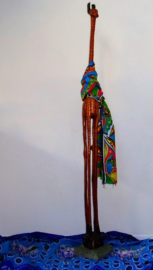 Op Schiphol doet ze ‘Giraffa’ een doek om, ‘niet zeuren het is koud buiten,’ verteld ze het houten beeld.